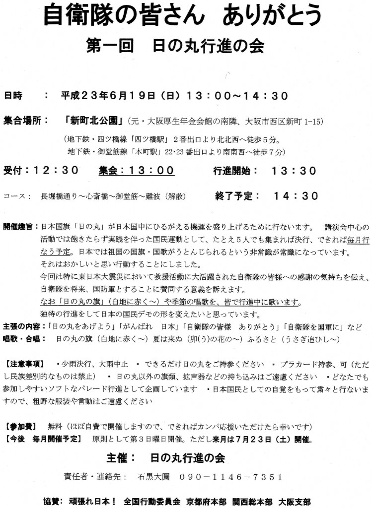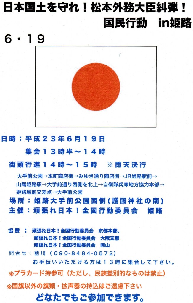 ————————————————————————————————————————————————– 昨日、京都で同席した石黒大圓さん(日の丸行進の会代表)からのお誘いで、急遽私(田辺)も撮影担当として参加する事となりました。大圓さんとは以前からNHK糾弾デモやチベット・ウイグル支援デモで御一緒させて頂いておりましたが、先日の中国領事館前南モンゴル人支援でもお会いしています。西成区での労働者支援等も行われておられ、ともかくフットワークの軽い方。 また下記の告知文のとおり姫路では「頑張れ日本!全国行動委員会 姫路」による松本剛明外務大臣(兵庫11区)に対する抗議活動を行うそうです。 なお松本外務大臣は初代内閣総理大臣 伊藤博文の孫の孫(玄孫)にあたる人物。つまり、伊藤博文-朝子(西源四郎妻)-清子(藤井啓之助妻)-清子(松本十郎妻)-松本剛明 と女系の後裔となるそうです。松本氏の外務大臣就任時に韓国紙では「初代韓国統監 伊藤博文の子孫」と紹介されていました。
