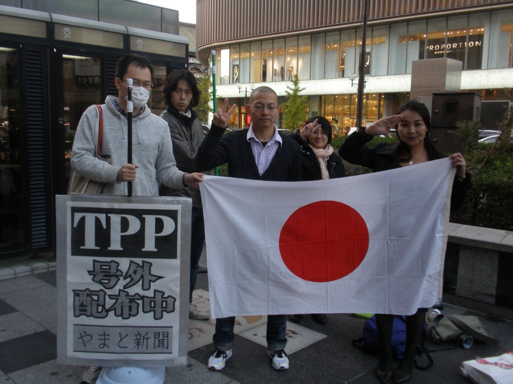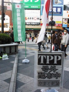 26日(土)13時〜16時。高島屋大阪店前において、やまと新聞社発行のTPP号外を10名程の協力者の方々と共に配布しました。この日は大阪市長・大阪府知事選挙のW選挙戦最終日でもあり、配布場所の南海なんば駅前には直前まで橋下徹大阪維新の会代表応援の為に石原東京都知事達が街宣活動を行なっていたそうです。準備していた3千部の号外は全て配布出来ました。TPPについての関心の高さを感じる事が出来ましたが、毎日新聞社が11月5・6両日に実施したTPP交渉についての全国世論調査では「参加すべき」が34%、「参加すべきではない」(25%)を上回る一方で、「わからない」が39%となっており「わからない層」が多くを占めています。この様な現状でのやまと新聞社による号外配布には情報提供と注意喚起の点で意義があったかと思います。全国で30万部が配布されたそうです。