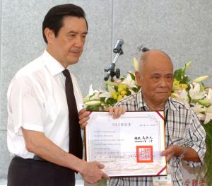 「戒嚴時期政治受難者紀念追思儀式」に於ける馬英九中国国民党主席と「名誉回復証書」を受ける李伸氏
