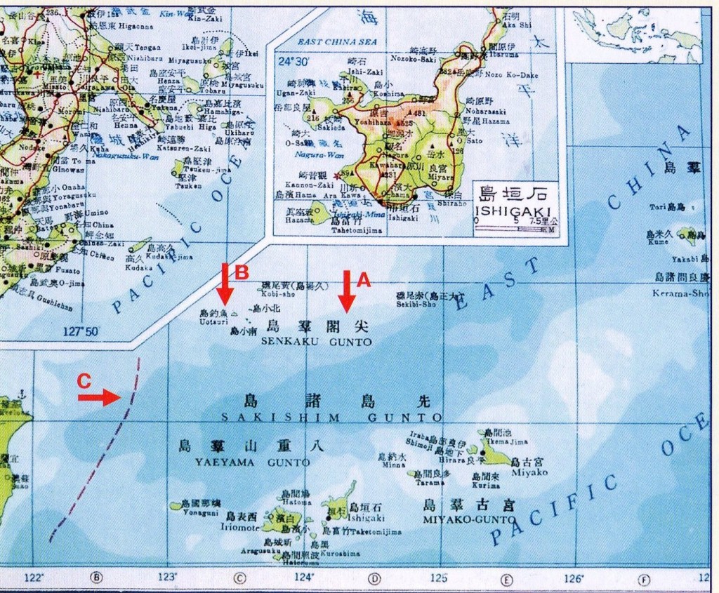 当然のごとく台湾で使用されている地図で1971年以前のものには「釣魚台」の名はない。日本の地名呼称である「尖閣諸島」(地図上矢印A)や「魚釣島」(同矢印B)「北小島」「南小島」「久場島」の島名が正確に記載されており、日本との国境線(同矢印C)は尖閣諸島を含まないように描かれている。この現象は中華人民共和国の地図帳においても同様であるが、1971年を境に台湾で使用される地図帳では「尖閣諸島」にかわり「釣魚台列嶼」という名称が登場することとなる。この様に尖閣諸島が断じて「釣魚台列嶼」ではないことを最も理解しているのが馬英九氏であり中国国民党である。