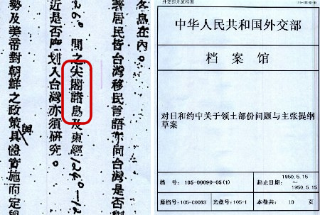 1950年5月、中国外務省作成『対日和約(対日講和条約)に於ける領土部分の問題と主張に関する要綱草案』原文コピー。【写真】(右)表紙、(左)P75に「尖閣諸島」の文字が。現在、中国共産党が尖閣諸島を「台湾の一部」として自国領土と主張する根拠は後付けの物である。何の事は無い、中国は建国当時から尖閣諸島が琉球(沖縄)附属島嶼と認識していたのだ。中国外務省档案館(外交史料館)収蔵