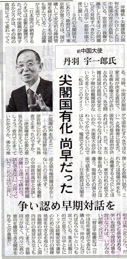 12月29日(土)の日本経済新聞朝刊において 丹羽宇一郎氏は「尖閣国有化 尚早だった」として「尖閣国有化も複数の中国政府高官と会談したが『日本は領有権問題が無いと言って終わり。話も出来ない』と言っていた。こちらは白と言い、相手は黒と言うなら、だれが見ても係争は有る。争いを認めて対話の場を設けなければ、いがみ合いが続くだけだけだ。」と自説を主張している。
