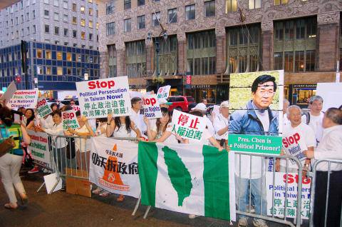 日曜日(8/11)夜、数十名の抗議者が馬英九総統がパラグアイ訪問途中に私的な夕食会を開いたGrand Hyatt New York Hotelの外に集まった。