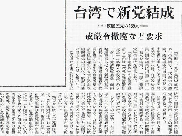 戒厳令下台湾での民進党結成を報じる1986年(昭和六十一)9月30日(火)毎日新聞朝刊.