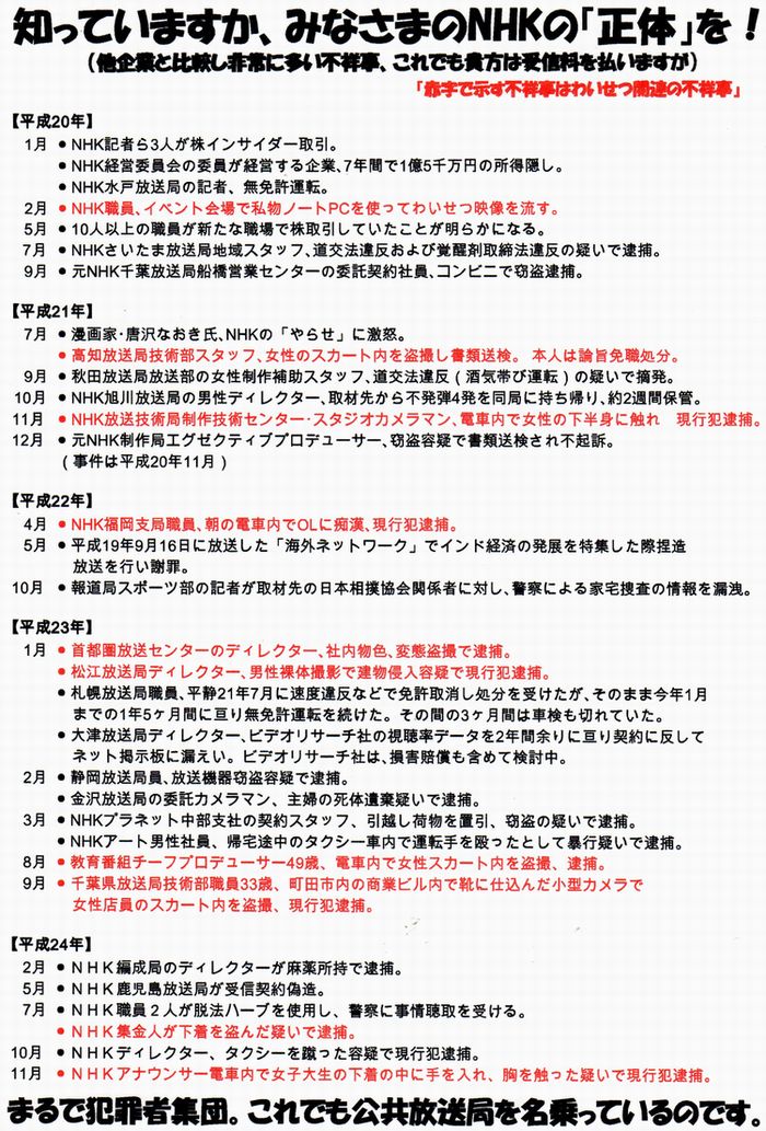 「NHK職員の犯罪が多発している。例えば強制猥褻、インサイダー取引、覚醒剤取締法違反、痴漢、公務執行妨害、暴行、麻薬所持、盗撮、死体遺棄など」
