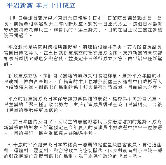【記録】平沼新党結党を報じる自由時報記事(4月7日号)