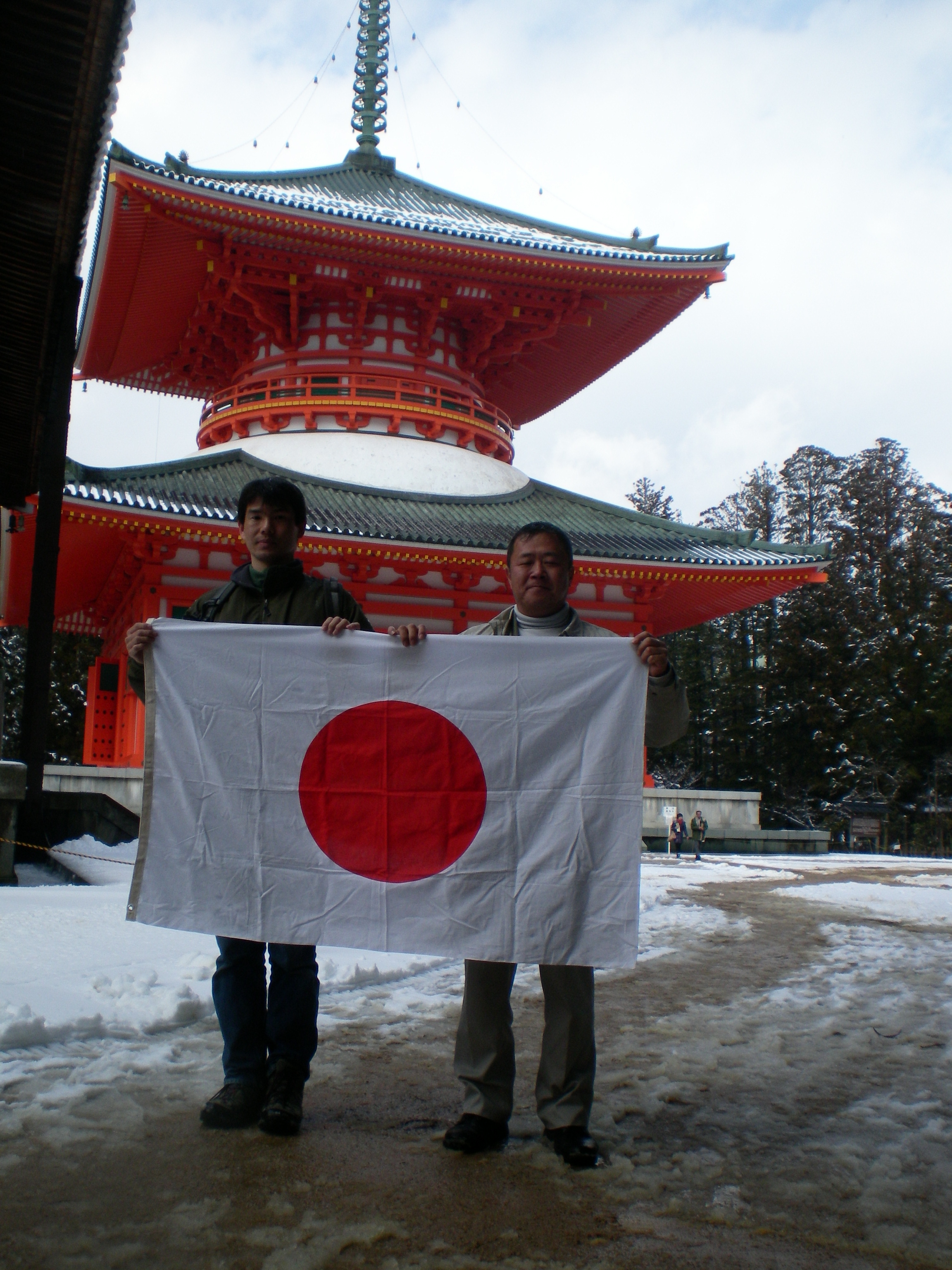 (右)高野山真言宗総本山金剛峯寺にて祖国日本の弥栄と台灣建国を祈願!この日の高野山は14時頃で気温2度、残雪がありました。冬季の平日という事で観光客は少なかったのですが、世界遺産登録(平成16年)の影響で欧米からの観光客も増えました。
